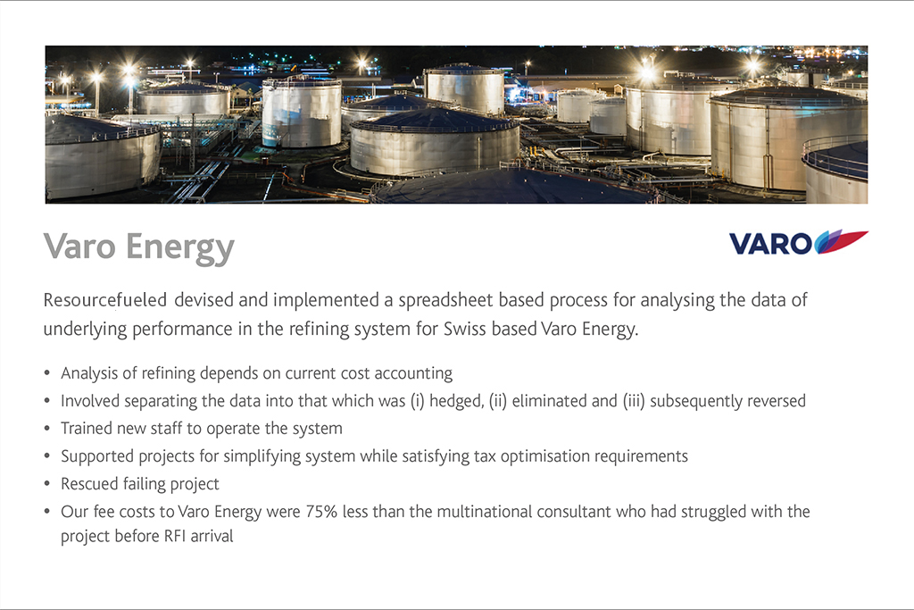Resourcefueled advises on a wide spectrum of issues. Including corporate strategic development, price risk management, ETRM evaluation and implementations and Diagnostic Reviews; change management, regulatory and ESG compliance updates.